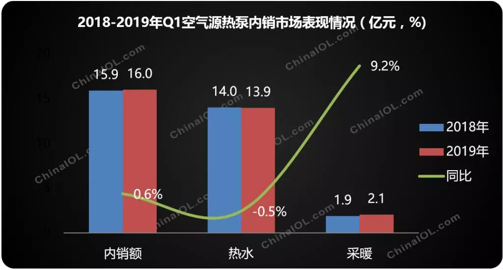 019年一季度,空气源热泵内销规模以微增长收官。在行业整体稳定的形势下,不同的产品线有升有降,在渠道和市场方面表现出明显的差异性。
